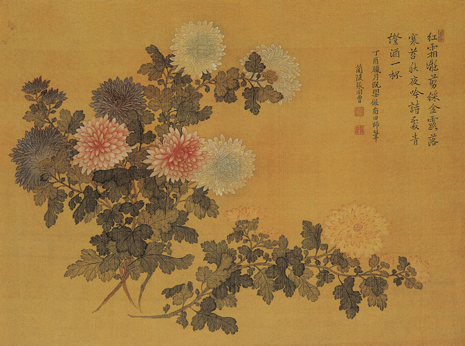 圖繪秋菊滿幅,繁簇似錦,爭(zhēng)奇斗艷,生機(jī)勃勃,表現(xiàn)出秋菊傲霜的品格。此畫用筆勁健灑脫,菊花結(jié)構(gòu)縝密,設(shè)色淡雅,滿紙菊花一氣呵成,充分體現(xiàn)出作者的高深功力, 張同曾的這幅《菊花圖》設(shè)色表現(xiàn)出菊花的嬌艷,筆墨輕松流利,很有特色。