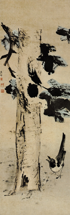 梧桐新枝老干,樹下喜鵲昂首翹尾,神態(tài)逼真。作者高其佩遠(yuǎn)師沈周,推崇陳道復(fù),深受明末清初朱耷諸家影響,尤重寫生,獨(dú)具一格,不隨時(shí)俗,下開“揚(yáng)州八家”端緒,對(duì)后世影響較深。此作構(gòu)圖新穎,對(duì)景寫生,運(yùn)思周詳,頗不易得。