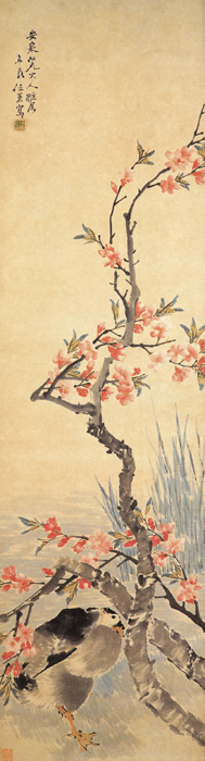 任薰的繪畫(huà)明顯地繼承了陳洪綬的風(fēng)格,雖沒(méi)有陳的高古、清逸之趣,卻顯得通俗平易,能收到雅俗共賞的效果。此圖繪桃花和在岸邊歇息的鳥(niǎo)。岸邊青草習(xí)習(xí),桃花燦爛多姿。