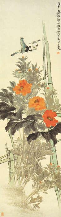 任頤大膽地嘗試各種鮮麗的顏色,在統(tǒng)一的色調(diào)中,使用補色對比,一幅畫中往往用一點極為奪目的紅色、藍色或橙色,這種統(tǒng)一色調(diào)中的補色運用,使畫面明快利落,像閃閃發(fā)光的寶石,取得“畫眼”的效果。如《紅芍藥圖》中描繪的紅芍藥,很是艷麗多姿,蝴蝶翻飛,輕盈靈動。