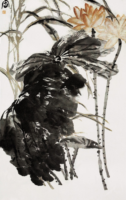 《紅荷圖》似不經(jīng)意,布局卻很別致,僅畫三張荷葉,占有畫面絕大部分,因他用羊毫軟筆,畫荷葉、荷梗任情揮灑,奔放雄秀,濕筆有韻,枯筆有氣,淡而不薄,深而不板,剛?cè)嵯酀?jì),潤而不洇,筆筆有力,墨法筆滋,意境清新、靜穆。二朵紅荷敷薄色,質(zhì)樸而惹人注目,蘆葦純以淡色出之,與荷葉深墨成對(duì)比,主次有別,層次分明,氣勢(shì)磅礴,是真正的大寫意,具有獨(dú)特的格調(diào)。