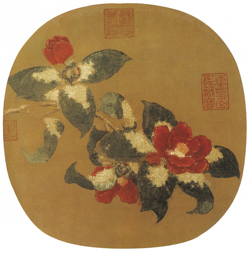 畫上無款。畫面畫山茶一枝,由左上角向?qū)切背觯嫫淙釛l,生發(fā)青空。畫家不取靜觀之勢(shì),而是從動(dòng)態(tài)中來描摹物態(tài),可謂匠心獨(dú)運(yùn)。山茶花葉嬌艷,臨風(fēng)輕舉。尤其突出的是花瓣花葉上殘余的霽雪,那種即將消融的白色與紅色的花瓣、深綠的花葉構(gòu)成一種色彩的絢爛和對(duì)比。