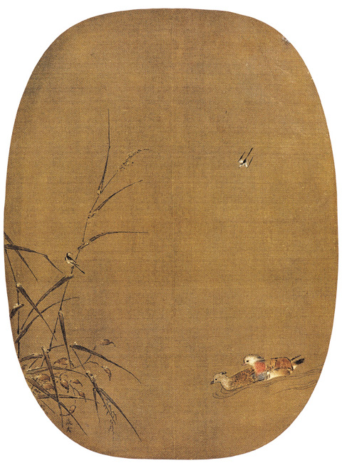 此圖原載《紈扇畫冊》(見《石渠寶笈續(xù)編》)。上有張茂題名。張茂,杭人,光宗時(1190一1194)在畫院,工山水花鳥,俱精致,小景更佳。此畫為池塘小景,在一雙鴛鴦的相趨逐之外,天空上有一小鳥疾而欲下,蘆葦枝上有一鳥棲停著而引頸上望,尺幅雖小卻具有尋丈之勢。