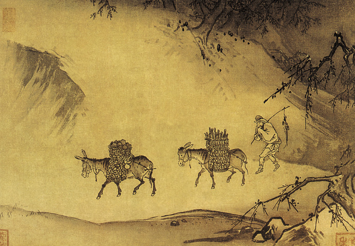 馬遠,字遙父,號欽山,山西永濟人。南宋光宗、寧宗時(1190—1224)的畫院待詔。家中五代皆為宮廷畫師。他繼承家學,擅畫山水,取法李唐而自出新意。多作“一角”、“半邊”之景,構圖別具一格,有“馬一角”之稱。此圖描寫大雪封山的清晨,一山民趕著兩只身馱木炭的小毛驢在白雪皚皚的山間行走。畫面近與遠的筆墨,濃與淡效果,有著較強的畫面空間感。