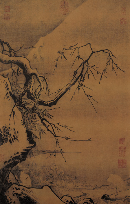 此圖顯示出馬遠(yuǎn)富有創(chuàng)造性的卓越構(gòu)圖技巧和特定的環(huán)境氣氛與意境的表達(dá)能力。隱約出現(xiàn)的遠(yuǎn)遠(yuǎn)的高大雪山的一角幾乎布滿整個(gè)畫面。以此為背景,不僅點(diǎn)明了作品的環(huán)境氣氛,而且對作為重點(diǎn)描寫的前景的山石、樹木起到很好的烘托作用。從左側(cè)伸出的帶有積雪的樹枝,向下彎曲后轉(zhuǎn)向右上伸長,橫斜曲折極富變化。左側(cè)及下部的山石,以帶水的墨筆作大斧劈皴畫出方硬有棱角的“一角”。