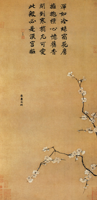 此圖是馬麟花鳥畫的存世名作。描繪綠萼梅兩枝,一俯一仰,婀娜多姿。據(jù)稱,綠萼梅花萼、蒂純綠,枝梗帶青,系梅花中極名貴的品種。畫面梅開似玉蕊占風,瓊葩含露,綽約玲瓏,清幽冷艷。扶疏的瘦枝玉蕊清冷,暗香浮動,為典型的“院體”宮梅。畫家以鉤勒法淡墨細線寫出花瓣,再層層填色。以水墨繪枝,重彩染花,強烈的對比映襯,生動地體現(xiàn)了寒梅冰肌玉骨之美。