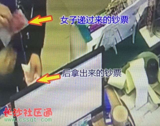 男顧客付的款,在店員驗過鈔票后,女顧客說有零錢,店員就把驗過的鈔票還給了男顧客。