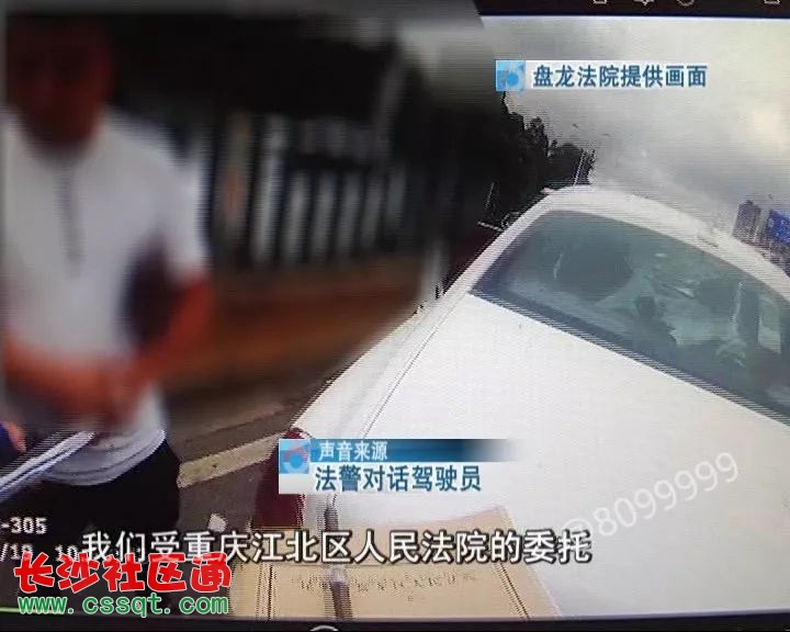 法警對話駕駛員:“下車,駕駛員下車,我們是盤龍區(qū)人名法院的,配合重慶江北人民法院調(diào)查!