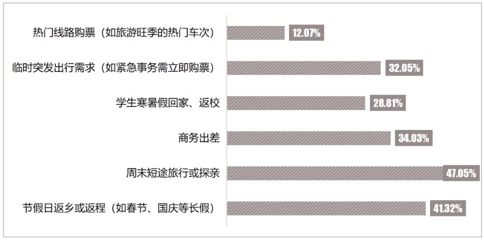 使用場(chǎng)景:主要使用場(chǎng)景集中在周末短途旅行(47.05%)、節(jié)假日返鄉(xiāng)返程(41.32%),以及商務(wù)出差(34.03%)、臨時(shí)突發(fā)出行需求(32.05%)等。