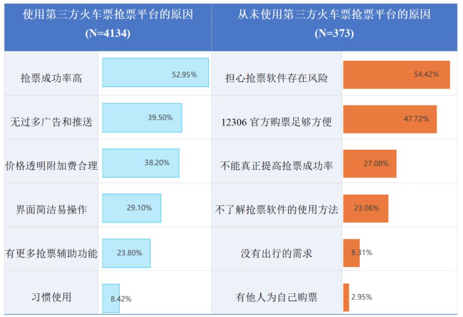 使用人數(shù)及原因:91.72%的受訪者使用過第三方火車票搶票平臺(tái),僅8.28%未使用,說明消費(fèi)者的使用需求較高。