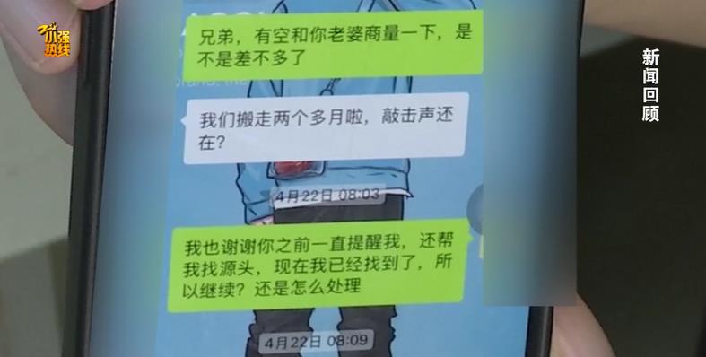 記者查看雙方的聊天記錄,這位租客也表示了疑問,自己搬走兩個(gè)月,為何敲擊聲還在?當(dāng)時(shí),記者也聯(lián)系上了6樓的業(yè)主陳先生。陳先生回應(yīng):“我們那個(gè)房子是沒有人住的,他三天兩頭打電話給物業(yè)、公安,說 樓上人在吵他,公安也來出警很多次了,我們也都配合他去看過。都沒有人居住的情況下他還要這樣,就是無理取鬧。”