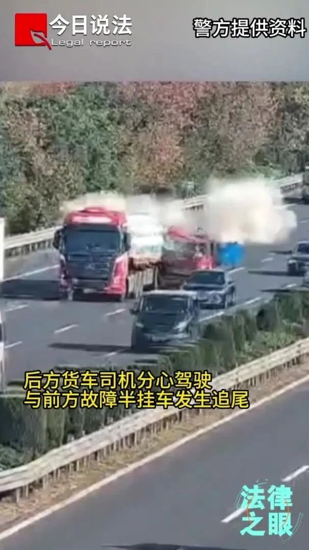 浙江紹興,一輛半掛車在高速車道內(nèi)突發(fā)故障,無(wú)法繼續(xù)行駛。半掛車司機(jī)未按規(guī)定在車后放置警示標(biāo)志,就直接開(kāi)始檢修作業(yè)。與此同時(shí),后方貨車司機(jī)分心駕駛,與正在檢修的半掛車發(fā)生追尾。后方貨車所運(yùn)載的洗潔精灑滿高速車道,所幸無(wú)人員傷亡。