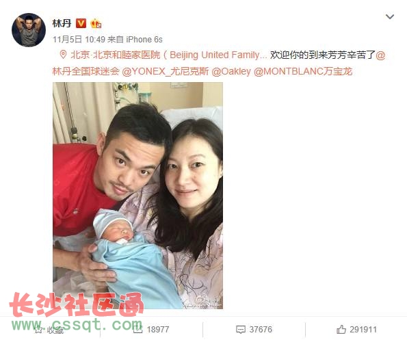 11月5日,林丹妻子謝杏芳于4日夜里在北京生下一個男孩。林丹5日發(fā)微博報喜“歡迎你的到來芳芳辛苦了”,并曬出了一家三口的幸福合影。