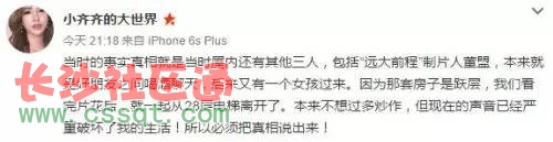 齊琦在微博中寫道,“當時的事實真相就是當時屋內(nèi)還有其他三人,包括“遠大前程”制片人董盟,本來就是好朋友之間喝酒聊天,后來又有一個女孩過來。因為那套房子是躍層,我們看完片花后,就一起從28層電梯離開了。本來不想過多炒作,但現(xiàn)在的聲音已經(jīng)嚴重破壞了我的生活!所以必須把真相說出來! ”