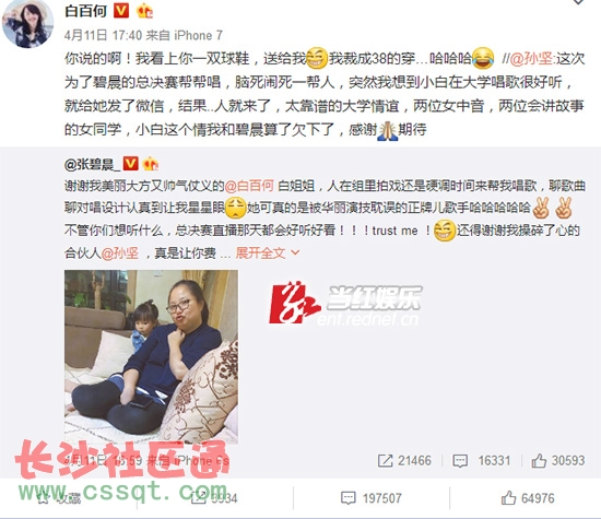 白百何與張碧晨微博互動證實將幫幫唱。