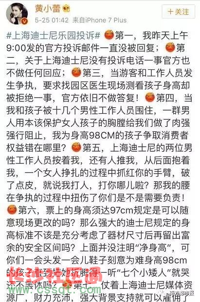 因?yàn)樯虾5鲜磕峁ぷ魅藛T不讓女兒玩“七個(gè)小矮人礦山車”游樂(lè)項(xiàng)目,昨日(24日)一大早7點(diǎn)多,演員黃小蕾在微博發(fā)文要投訴迪士尼工作人員,她認(rèn)為女兒身高符合規(guī)定,可以玩“七個(gè)小矮人礦山車”,卻遭到工作人員刁難,“工作態(tài)度冷漠無(wú)情,故意刁難,不誠(chéng)實(shí)!他反復(fù)刁難身高符合標(biāo)準(zhǔn)的孩子,撒謊不誠(chéng)實(shí),明明孩子測(cè)量通過(guò)還各種找理由說(shuō)沒(méi)達(dá)標(biāo),居然給我的理由“孩子有頭發(fā)”!”