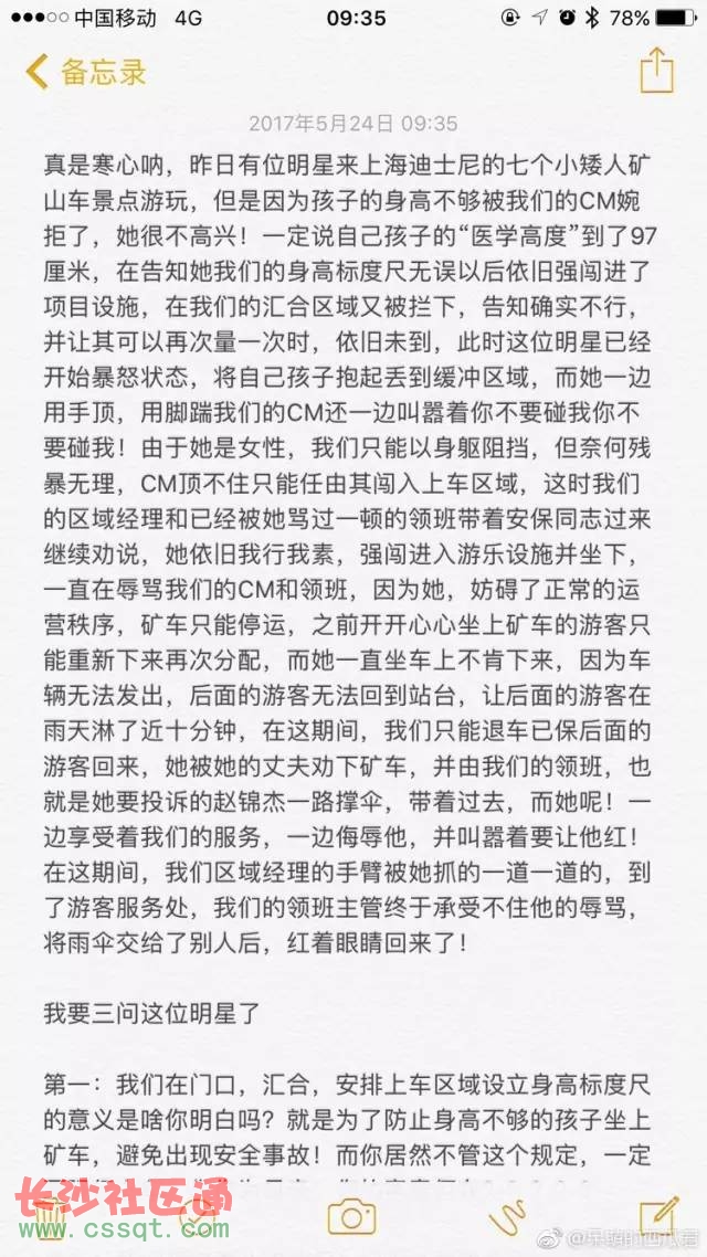 事情的整個(gè)經(jīng)過(guò)如下:2017年5月23日清晨,我們?nèi)胰藬y女兒一大早五點(diǎn)多就起床,乘坐八點(diǎn)的飛機(jī)從北京趕往上海迪士尼樂(lè)園,結(jié)果上海天氣不佳一直小雨不斷,由于女兒身高只有98CM,所以我們很多項(xiàng)目都無(wú)法參與,我們帶著孩子在雨里溜達(dá)一下午,渾身上下都濕透啦,就玩了一個(gè)海盜船項(xiàng)目,后來(lái)終于找到《七個(gè)小矮人》的礦山小火車,心里挺高興終于有可以玩兒的項(xiàng)目了。沒(méi)想到,一位叫“趙錦杰”的工作人員不知是什么原因,明明是超過(guò)97CM身高的孩子卻通過(guò)有皮筋、頭發(fā)蓬松、穿鞋了、沒(méi)站對(duì)地方等不是理由的理由百般刁難,導(dǎo)致孩子經(jīng)歷了六次測(cè)身高,而且好幾次站直了頭碰木頭都委屈的哭了還不肯罷休。。∮谑俏液苌鷼獾谋е⒆诱f(shuō):“別折騰孩子了,就這一個(gè)項(xiàng)目我是看好身高達(dá)標(biāo)才來(lái)的,少拿雞毛當(dāng)令箭!”也許是他心里不爽了,然后就把事情搞得越來(lái)越復(fù)雜,加倍刁難,還作出一副無(wú)辜的樣子,擺出對(duì)孩子負(fù)責(zé)的高姿態(tài)。隨后,“趙錦杰”找來(lái)“沈偉春”經(jīng)理協(xié)調(diào),又重量身高,孩子身高明明夠了假裝沒(méi)有看見包庇同事,還說(shuō)找個(gè)沒(méi)人的地方單獨(dú)解決,別的都可以玩兒,言下之意,大家都看著,即便孩子身高夠了,我們也不能當(dāng)著這么多游客放行,這樣顯得工作人員太不講理了。之后,我不同意將錯(cuò)就錯(cuò),于是他們又找來(lái)保安,保安也茍同經(jīng)理只顧在一旁攝影拍照,一副人多勢(shì)眾的架勢(shì),將近10位保安和工作人員將抱著孩子的一個(gè)弱女子包圍在里面,后來(lái)我們發(fā)生爭(zhēng)執(zhí),他們終止娛樂(lè)設(shè)施,為了后面的乘客不受影響,我?guī)е⒆又鲃?dòng)從車上下來(lái)了……然后,所謂的園區(qū)老大“范玥”經(jīng)理前來(lái)處理此事,我們又給孩子測(cè)量身高,孩子的頭幾次超出并撞到測(cè)量桿,這位范經(jīng)理為了保庇同事“趙錦杰”卻各種找理由和借口,孩子哭得泣不成聲也絲毫不理會(huì),還說(shuō):“可能差一點(diǎn)點(diǎn),有時(shí)候也沒(méi)碰到!彼f(shuō)的有時(shí)候是孩子一直摟著我脖子傾斜或者兩腿分開的時(shí)候,可好幾次超過(guò)了他卻故意不提。最后我提出投訴“趙錦杰”,要拍她名字和照片他居然逃跑了?!真是化腐朽為神奇,更神奇的是這位“范玥”經(jīng)理居然還協(xié)助他逃離現(xiàn)場(chǎng),我問(wèn)他為什么不讓我記下他的樣子和名字,“范經(jīng)理”居然傲慢無(wú)禮的說(shuō):“我安排他別的工作了!”