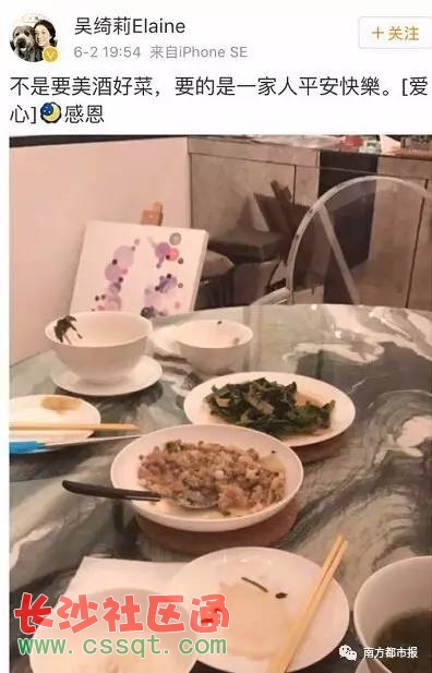 而就在被拍到母女合體逛街的當(dāng)晚(2日),吳綺莉在微博發(fā)出“不是要美酒好菜,要的是一家人平安快樂。[愛心][月亮]感恩 ”的感嘆。這估計(jì)是吳綺莉期待已久的一頓飯吧。
