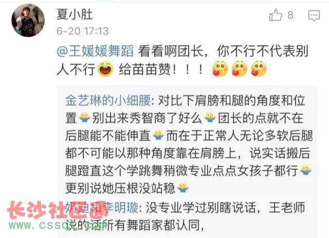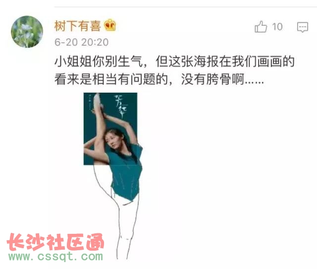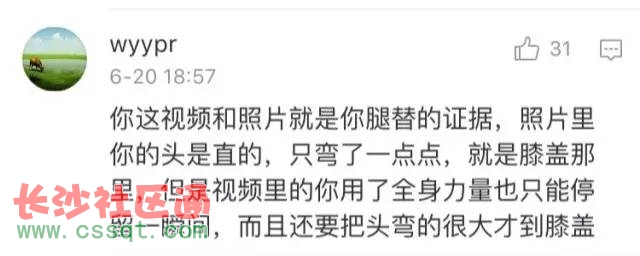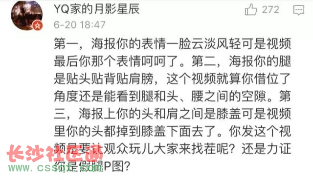 接著,費丹分析了演員苗苗的劈腿視頻——“她可以做到是另一回事,但海報里不是一個人做的。”“如果要做到這個動作,挺難的,腿很難跟腦袋靠得像海報上那么近。