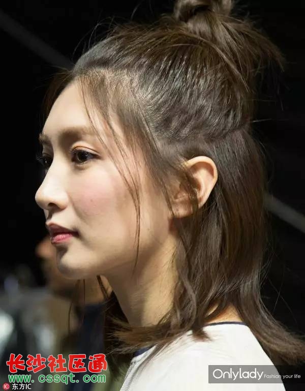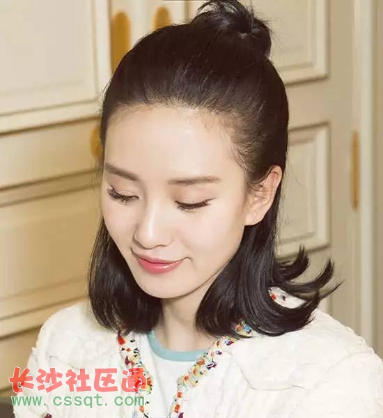 江疏影喜歡額頭兩邊留少許碎發(fā)的半扎款,這種丸子頭清爽減齡,百搭發(fā)型之一。