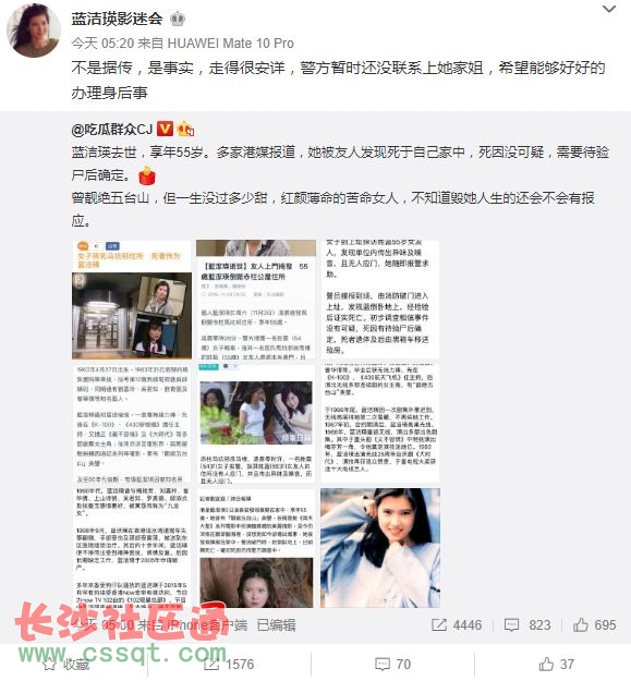 藍(lán)潔瑛影迷會(huì)今晨發(fā)文悼念,表示:“藍(lán)潔瑛走得很安詳,警方暫時(shí)還沒聯(lián)系上她家姐,希望能夠好好的辦理身后事!