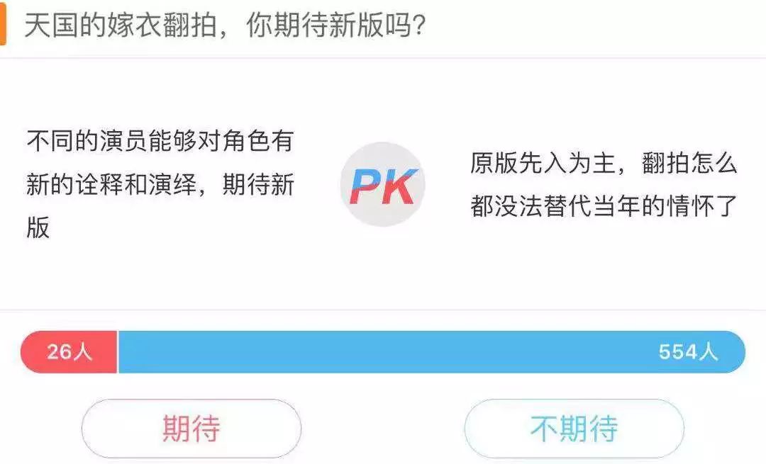 要說最近最火的拍攝電視劇的方法是什么?毋庸置疑,必須是翻拍偶像劇。從《流星花園》到《泡沫之夏》,無數(shù)經(jīng)典偶像劇被翻出來重炒。 近日,據(jù)廣電總局11月電視劇備案,經(jīng)典臺灣偶像劇《天國的嫁衣》也要翻拍了,預計2019年10月開拍。 聽到這個消息,很多網(wǎng)友都驚呼“國產(chǎn)劇編劇是沒有靈感了嗎?” 還有網(wǎng)友大喊“放過我的童年吧!“ 微博上還發(fā)起了名為“天國的嫁衣翻拍,你期待新版嗎?”的投票,看看這結果,絕大部分人是不期待的。這樣看來,新版的編劇和男女演員們面對的壓力和挑戰(zhàn)都是不小的啊。 《天國的嫁衣》相信是很多人童年非常喜歡的一部偶像劇了,劇中甜心教主王心凌扮演的陶艾青是一個樂觀開朗天真善良的農場主的女兒,與她發(fā)生感情線的有多金又有才的服裝設計師陸子皓(立威廉飾),還有熱愛機車、痞帥痞帥的程海諾(明道飾)。 娛樂君到現(xiàn)在還記得在看大結局程海諾叫陶艾青去找回陸子皓時哭得稀里嘩啦的。 王心凌的清純和可愛,可謂是十分吸引人。 立威廉真的好像一個王子哦,氣質尊貴,笑容也迷人。 明道也不差,這痞帥痞帥的樣子,真的會讓人少女心爆棚啊。 怪不得很多網(wǎng)友都說,經(jīng)典版的主演們是無可取代的。 除了《天國的嫁衣》,還有許多經(jīng)典的偶像劇也要被翻拍,其中就包括《王子變青蛙》、《命中注定我愛你》和《一吻定情》。 首先是《王子變青蛙》,明道可謂是偶像劇男神啊,基本上是每拍一部火一部。 來來來跟娛樂君一起唱“命中已注定是我太任性......” 單均昊出場時那霸氣外露的樣子,這才是真正的霸道總裁啊。 飾演葉天瑜的陳喬恩,也是名副其實的偶像劇女王啊。 然而,這部經(jīng)典也難逃被翻拍的命運。 網(wǎng)友們對此也頗有意見,大喊“能不能不要動我的王子變青蛙!” 還有人提出之前的《愛情睡醒了》不就是模仿《王子變青蛙》的嘛? 仔細一想,好像真的劇情有點相似。 不過娛樂君也很想知道由誰來飾演單均昊這個霸道總裁呢?畢竟像明道這樣走路帶風,眼神帶有霸氣的人不多啊。 除此之外,《命中注定我愛你》也要被翻拍了。 這可是娛樂君每次看必哭的一部劇啊。 各位各位,《心愿便利貼》、《九十九次我愛他》唱起來! 陳喬恩飾演的陳欣怡真的是讓人好心疼,阮經(jīng)天飾演的紀存希也是帥的不要不要的,特別是這眉毛,是非常好看了! 陳楚河飾演Dylan也是又帥氣又暖心。 有的網(wǎng)友對翻拍表示出不太積極的態(tài)度。 有的很無奈,反問道“現(xiàn)在都沒編劇了嗎?” 據(jù)說,翻拍后的名字叫做“你是我的命中注定”。陳欣怡改為陳嘉欣,紀存希改為王析翊,Dylan改名為狄倫。 emm......娛樂君表示還是以前的名字好聽hhhhhh。 不過根據(jù)非官方消息,女一將由譚松韻飾演,男一將由彥希飾演。 網(wǎng)友們對譚松韻的認同度還是不錯的,但不知道是不是真的呢? 最后還有一部不得不提,那就是《一吻定情》。這其實也就是《惡作劇之吻》的翻拍。 前幾周娛樂君寫完“江直樹人設崩塌”的文章后,硬是熬了兩個通宵,把《惡作劇之吻》又重溫了一遍。這部劇真的是百看不厭啊。 袁湘琴(林依晨飾)那傻傻的樣子,那為愛勇敢的樣子,是許多人想成為的樣子啊。 江直樹(鄭元暢飾)那高冷禁欲系男神的樣子,真的是很多人心目中的男神啊。 敲黑板了敲黑板了,這部經(jīng)典的偶像劇被翻拍成《一吻定情》電影版,正式定檔2019情人節(jié)! 江直樹由王大陸飾演,而女主則由林允擔任。 這......有點出乎意料。 許多網(wǎng)友都覺得王大陸不太適合飾演高冷學霸,畢竟他在《我的少女時代》里面的壞壞的痞痞的形象已經(jīng)深入人心了。反而和高冷以及學霸這樣的定位掛不上鉤啊。 還有網(wǎng)友擔心笑稱這是他見過嘴最大的江直樹。 不過,還是有不少網(wǎng)友對這部電影表示期待的。 至于最終的效果的如何,也只能明年電影院見分曉了。 縱觀所有被翻拍的偶像劇,網(wǎng)友們對此都持有不是特別積極的態(tài)度。也許是因為這些經(jīng)典的偶像劇已經(jīng)成為許多人回憶中不可磨滅的一部分了,甚至已經(jīng)達到了無可取代的地步了。 翻拍電視劇未嘗不可,只是有經(jīng)典的存在,翻拍的電視劇要做得更出色更出彩,這還是很困難的, 或許,創(chuàng)作更多的新劇,才是更好的出路吧。