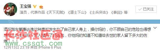 12月13日23時(shí)19分,王寶強(qiáng)在微博中爆粗,痛斥酒駕肇事逃逸者,疑似有家人在車禍中身亡。